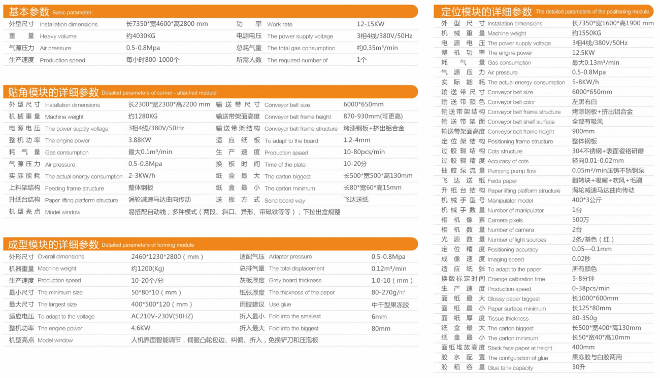 The machine is mainly divided into three parts: positioning module, angle sticking module and forming module. It can realize automatic paper feeding, automatic glue passing, automatic angle sticking, automatic positioning, automatic forming and automatic bubble pressing in the production of all kinds of cartons, wooden boxes and plastic boxes. A series of technological processes can be completed automatically, the plate can be transferred quickly, and the box body can be made exquisitely I'm not. Non adhesive tape slot and double lift paper table of corner module. The intelligent adjustment, automatic locking, servo cam action, no change blade and pressure foam board of the molding module are designed and produced by our company, and have obtained a number of national patents.