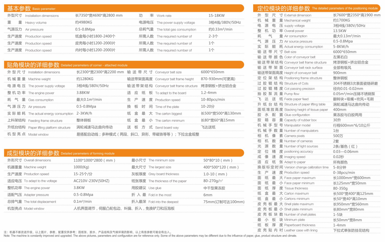 该机主要分为定位模块、贴角模块和成型模块三大部分,可实现各类纸盒、木盒、胶盒生产时的自动送纸、自动过胶、自动贴角、自动定位、自动成型和自动压泡等,系列工艺工序的自动完成,转版速度快,制作盒体精美。定位模块的黑白皮带、双镜头、自动纠偏、皮壳板贴衬定位、五片板定位。贴角模块的不粘胶胶带槽、双升纸台。成型模块的智能调节、自动锁固、伺服凸轮动作、免换铲刀和压泡板等,均由我司自行研发设计生产,并获得多项国家专利。