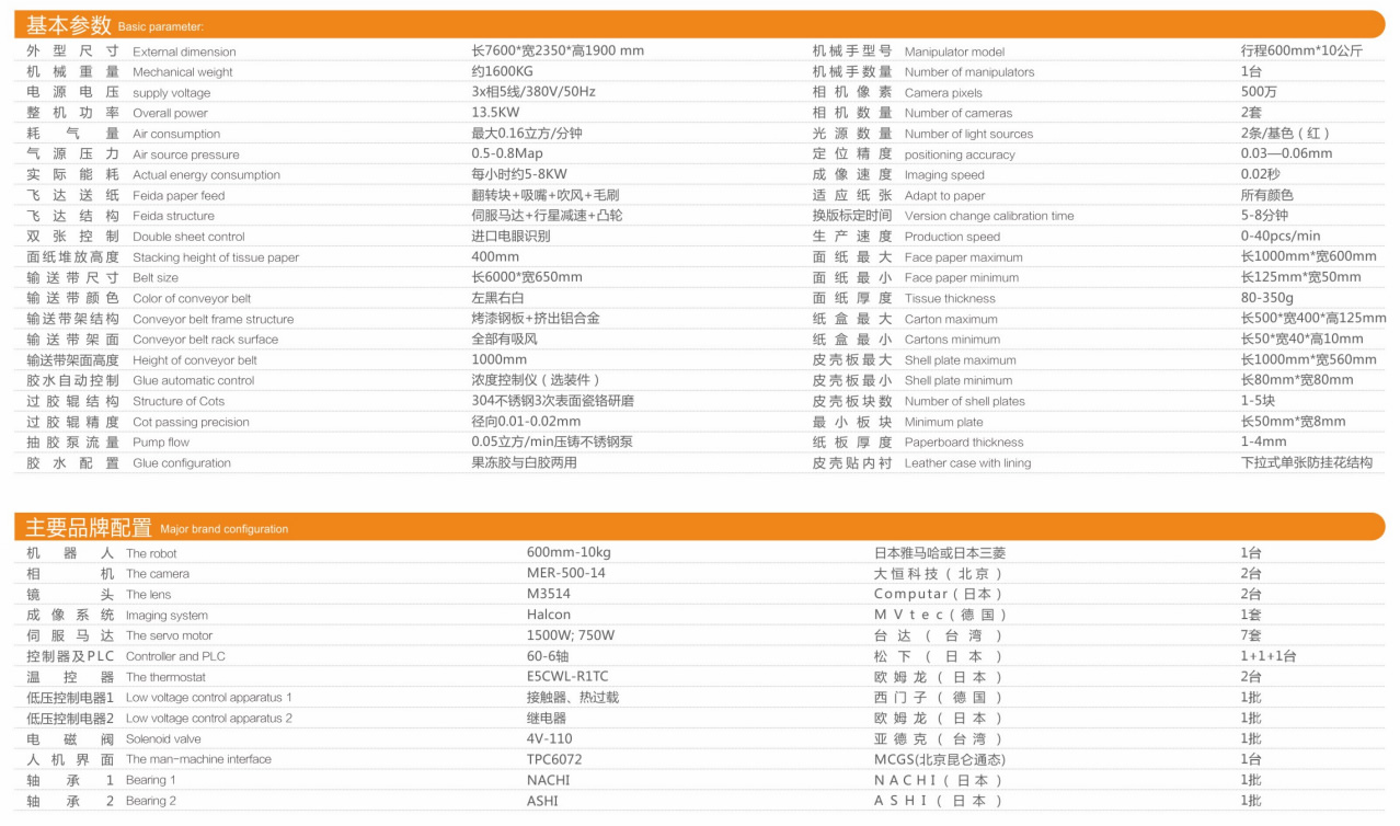 本机采用日本三菱 600 行程机械手,进口摄像头,松下 pLc 等国际高端电器,定位尺寸大,精度高,运行稳定.速度快,可操控性强,转版调机五分钟左右,适合各种纸盒、皮壳、内神狗送纸、过胶、对位生产,尤其是下拉式贴内衬装置完全解决了皮壳刮花的问题。该机全部由本公司自主研发、设计、生产,其中伺服凸轮飞达部分、过胶部分、榴字控制部分已经获得多项国家专利。