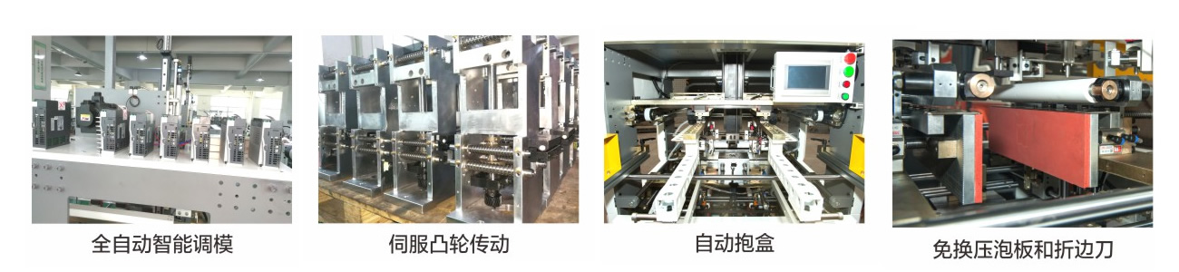 3.免换压泡板和折边刀:该机已经装好固定长度的压泡板和折边刀,适应任意尺寸纸盒的生产,无需更换拆卸,节省了转板时间和成本。